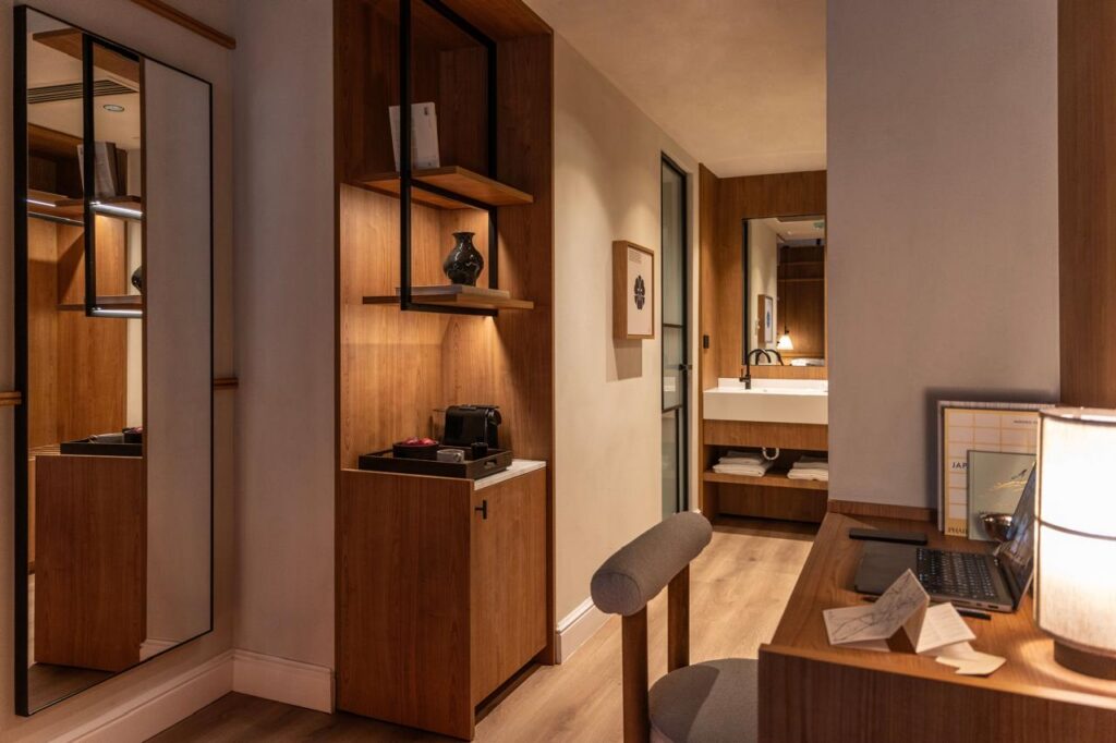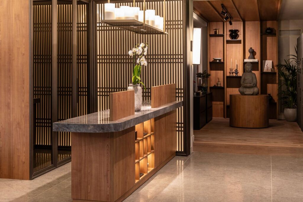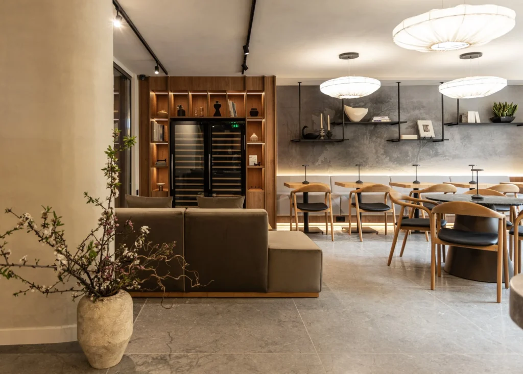 Αντλώντας έμπνευση από την ιαπωνική αισθητική, ο εσωτερικός σχεδιασμός δίνει έμφαση στην απλότητα, την ισορροπία και την αυθεντικότητα των υλικών. Γεωμετρικές συνθέσεις, ζεστοί γήινοι τόνοι και η εκτεταμένη χρήση φυσικών υλικών — ιδιαίτερα του ξύλου — δημιουργούν μια ήρεμη και εκλεπτυσμένη ατμόσφαιρα, δημιουργώντας έναν λεπτό διάλογο μεταξύ της ανατολίτικης ευαισθησίας και του αθηναϊκού αστικού περιβάλλοντος.
