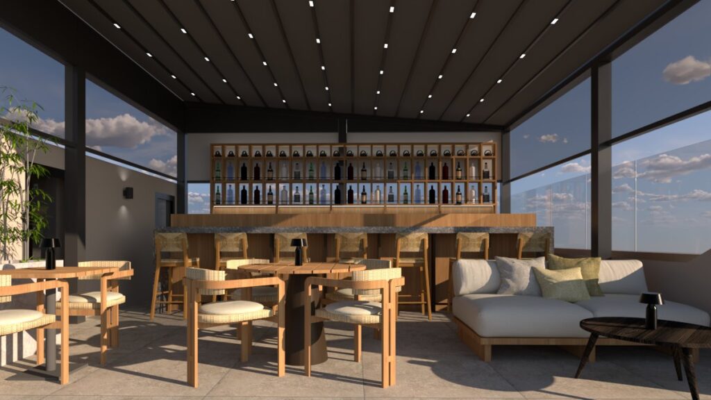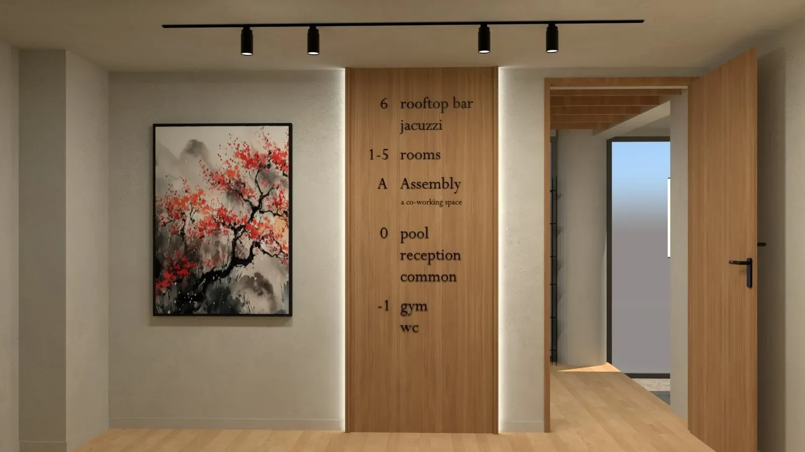 Το ισόγειο στεγάζει έναν φιλόξενο χώρο υποδοχής, μπαρ και κατάστημα λιανικής, επεκτεινόμενο προς τα έξω σε μια διαμορφωμένη υπαίθρια ζώνη με πισίνα, δημιουργώντας ένα ήρεμο αστικό καταφύγιο μέσα στον πυκνό αστικό ιστό. Ένα επίπεδο ημιορόφου εισάγει ευέλικτους χώρους συνεργασίας για τους επισκέπτες που αναζητούν ένα παραγωγικό περιβάλλον, ενώ το υπόγειο στεγάζει λειτουργίες εξυπηρέτησης και υποστήριξης μαζί με έναν συμπαγή χώρο γυμναστικής.