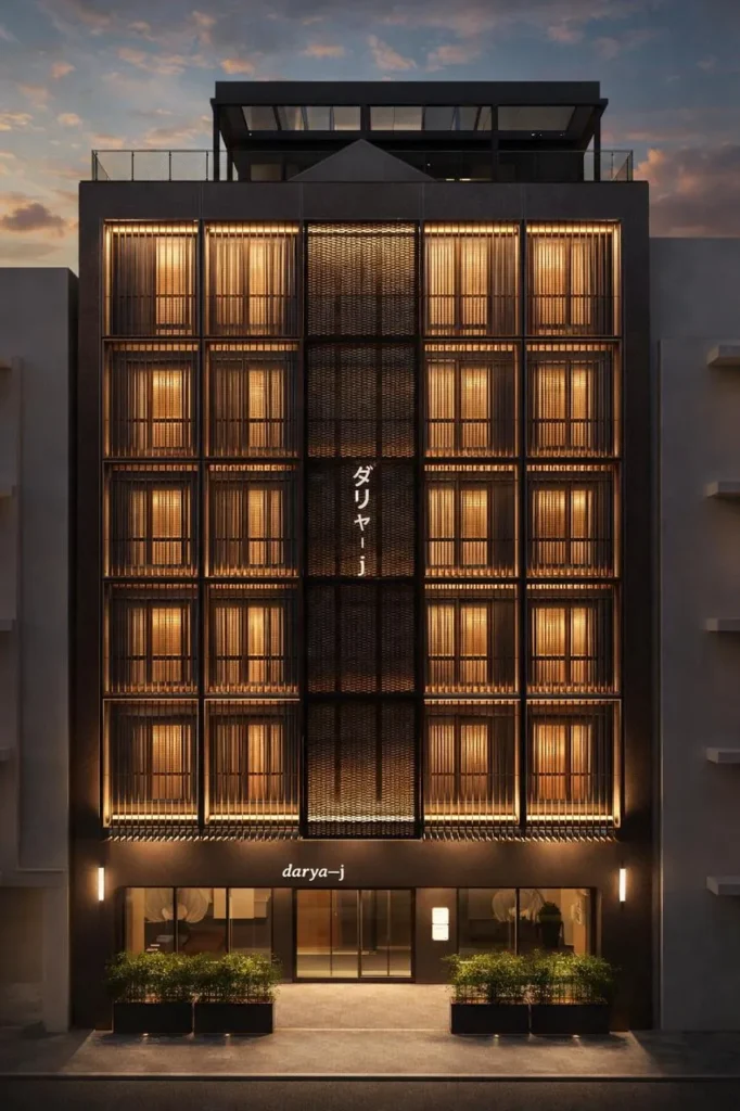 Η αρχιτεκτονική γλώσσα της πρόσοψης παραπέμπει στα παραδοσιακά ιαπωνικά παραβάν, διαρθρωμένη μέσω κάθετων περσίδων και ενός λεπτοϋφασμένου συστήματος δικτυώματος που οργανώνει την όψη με ρυθμό και συγκράτηση. Λειτουργώντας ως παθητική διάταξη σκίασης, αυτά τα στοιχεία φιλτράρουν το φως της ημέρας, ενισχύουν την ιδιωτικότητα και εισάγουν βάθος και υφή στο κέλυφος του κτιρίου.
