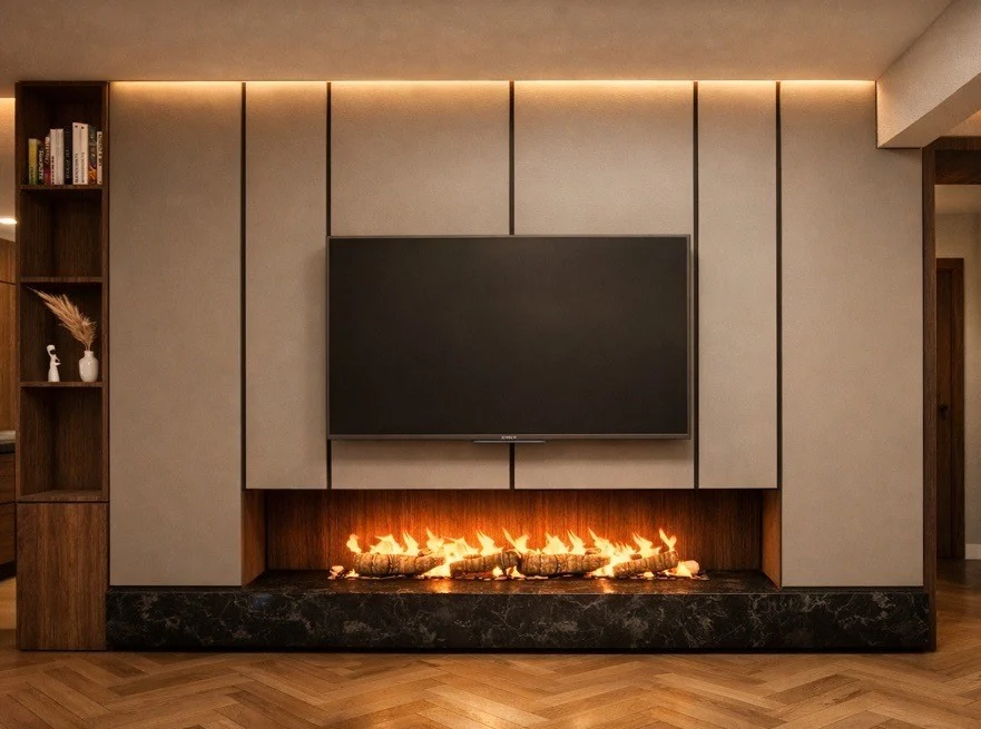 Ο χώρος ττου καθιστικού είναι διαμορφωμένος γύρω από ένα κεντρικό σύνολο καθισμάτων που δίνει έμφαση στην άνεση και τις αναλογίες. Ένας τοίχος με τζάκι και ο κρυφός φωτισμός προσδίδουν βάθος και αναδεικνύουν την αρχιτεκτονική γεωμετρία του δωματίου.