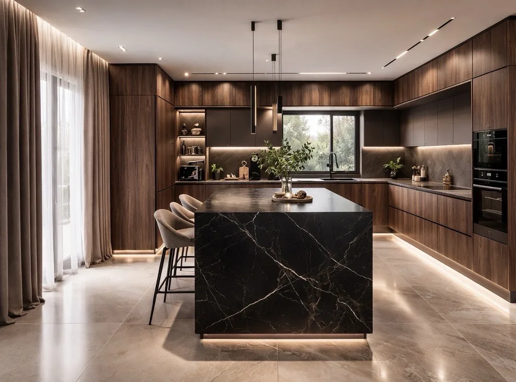 Η κουζίνα ακολουθεί μια πιο αρχιτεκτονική προσέγγιση, συνδυάζοντας σκούρα φυσικά υλικά με καθαρές γραμμές και ενσωματωμένο φωτισμό. Αποτελεί ένα ισχυρό σημείο εστίασης στο ενιαίο χώρο.