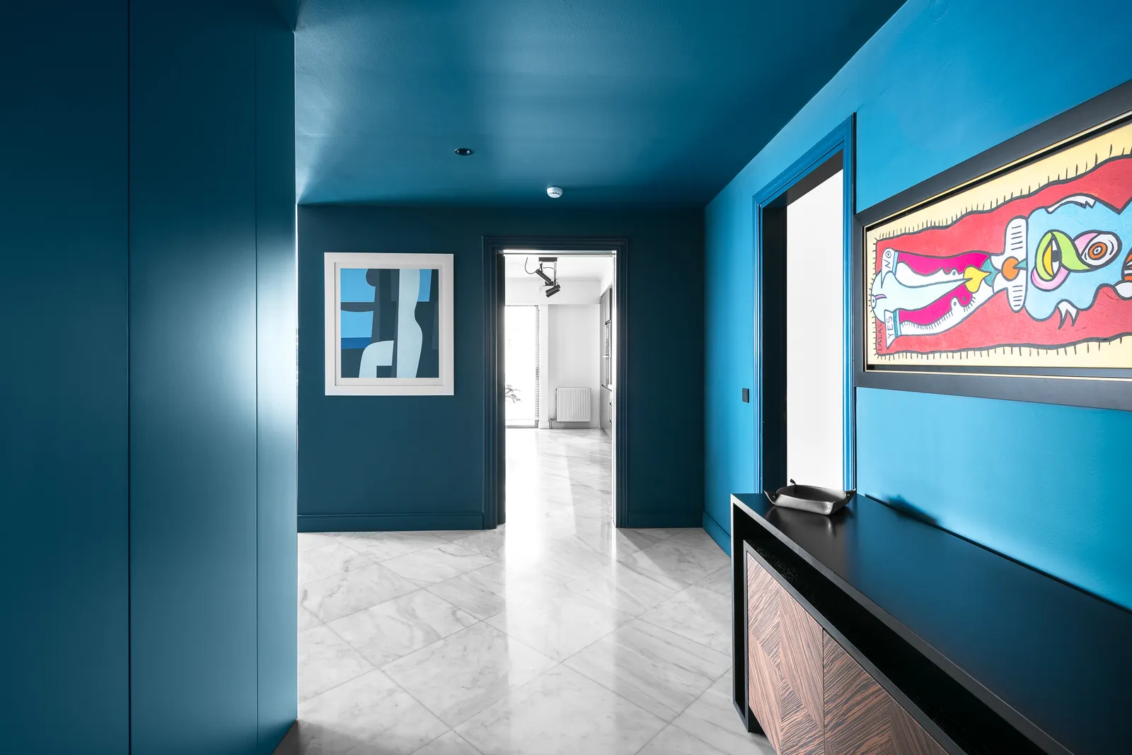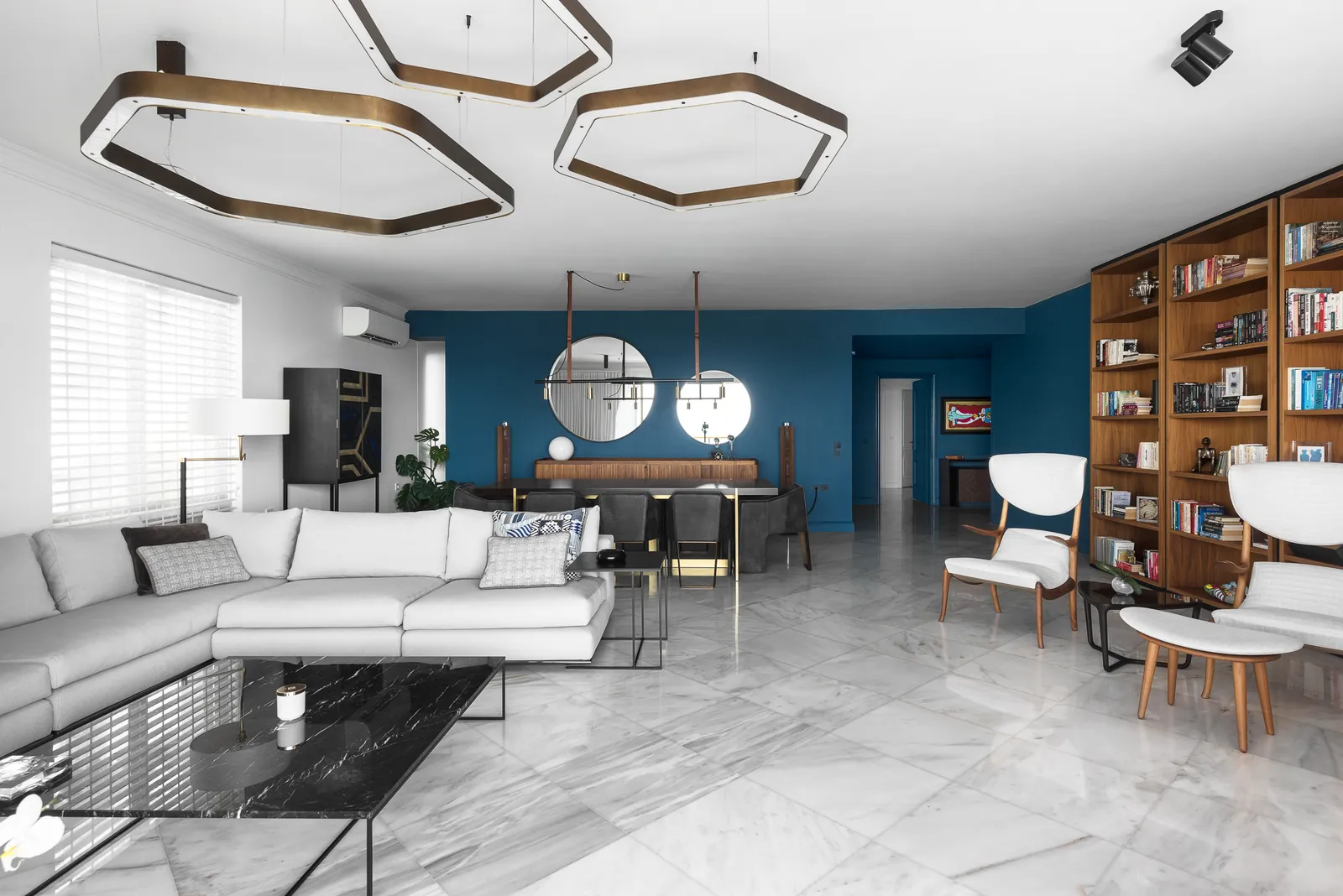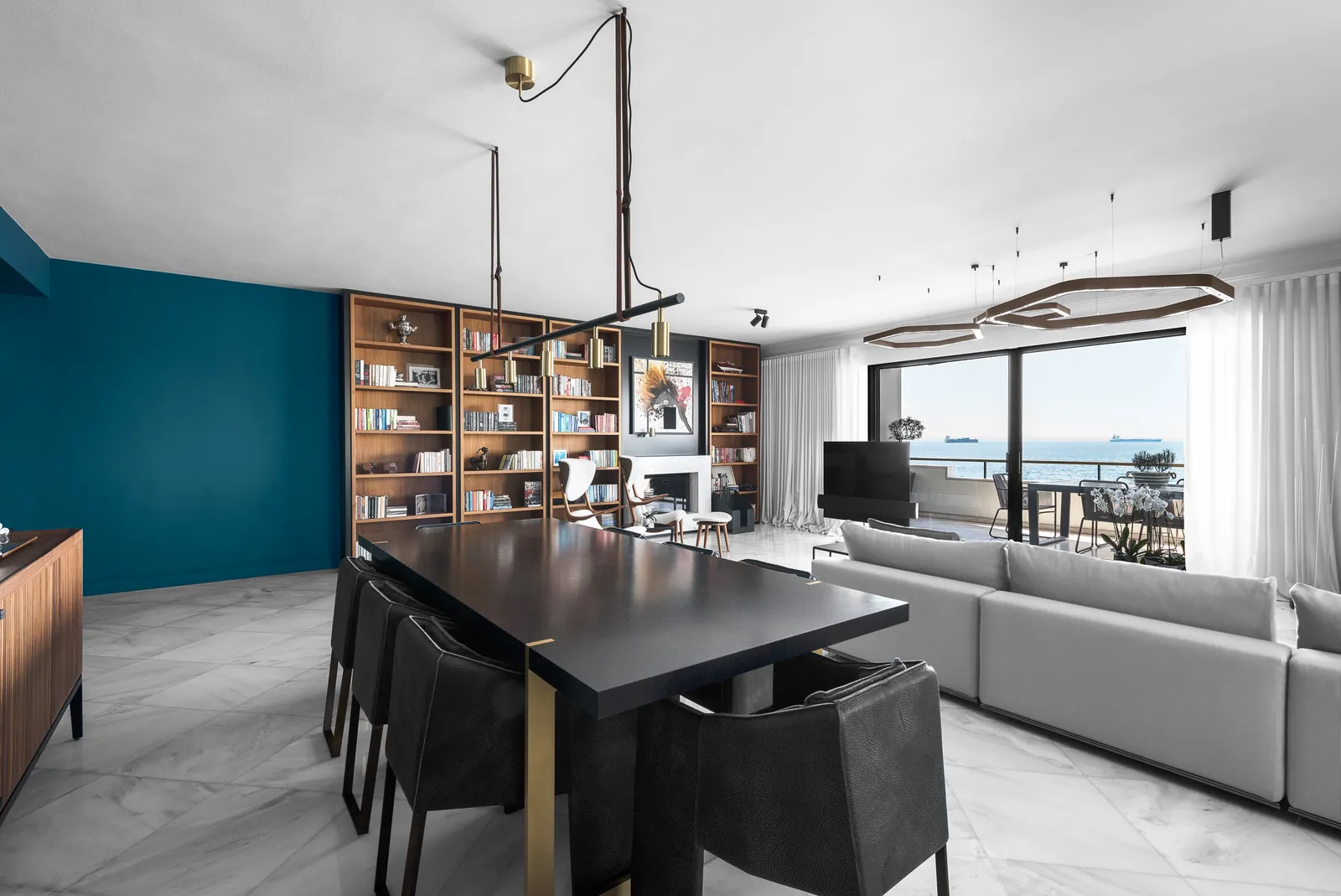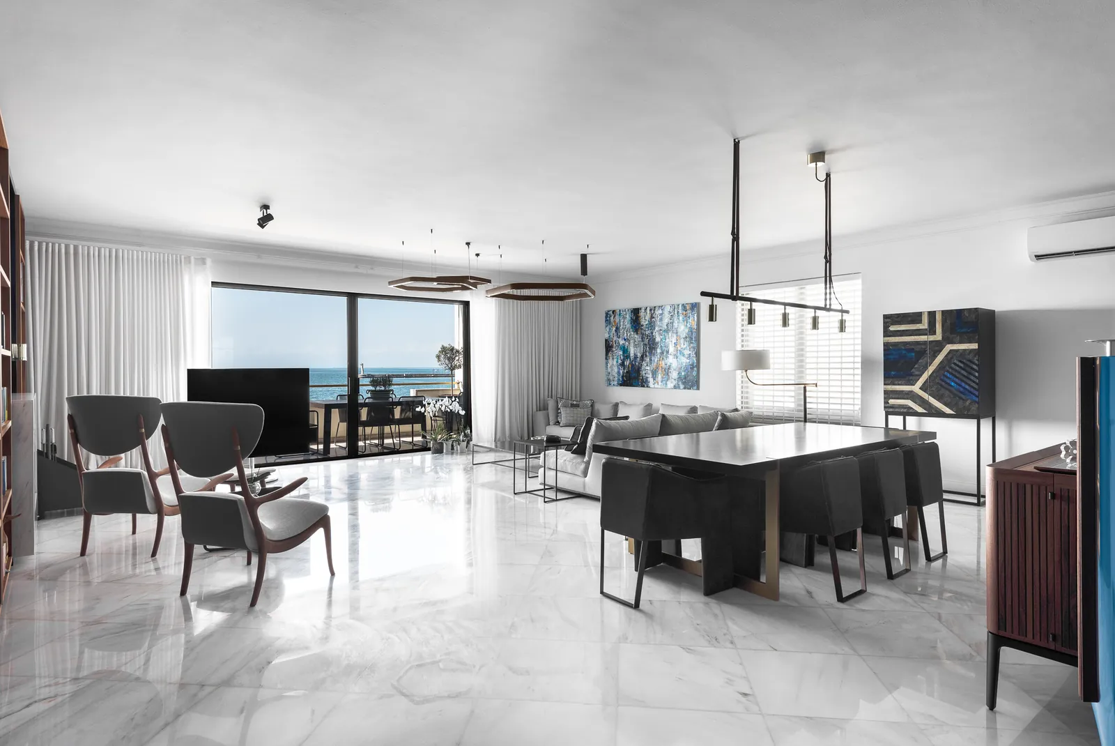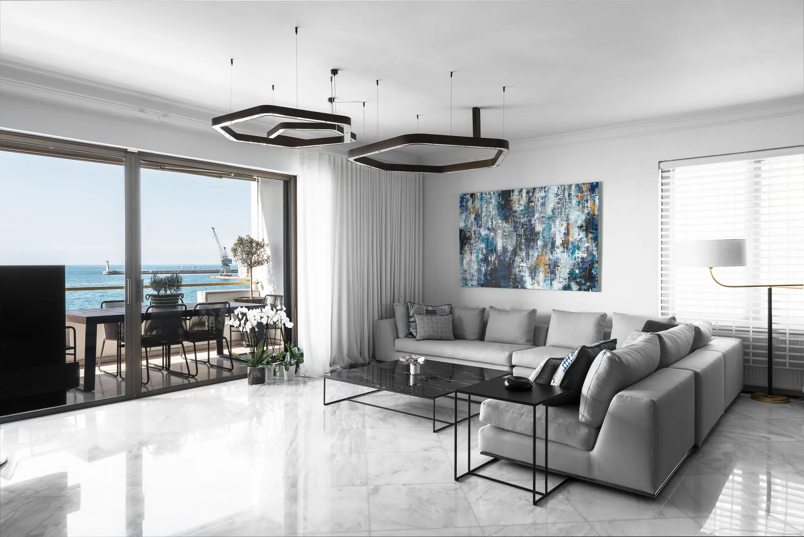 Οι χώροι διαβίωσης είναι οργανωμένοι ώστε να αγκαλιάζουν πλήρως την εκτεταμένη παραθαλάσσια θέα. Το λευκό μαρμάρινο δάπεδο δημιουργεί μια φωτεινή βάση σε όλους τους κύριους χώρους, ενισχύοντας το φυσικό φως και την αίσθηση της ευρυχωρίας. Φωτεινές, προσεκτικά επιλεγμένες χρωματικές πινελιές εισάγουν ενέργεια και σύγχρονο χαρακτήρα, επιτρέποντας στο καθιστικό να είναι ταυτόχρονα κομψό και εκφραστικό χωρίς να θυσιάζει τη σαφήνειά του.