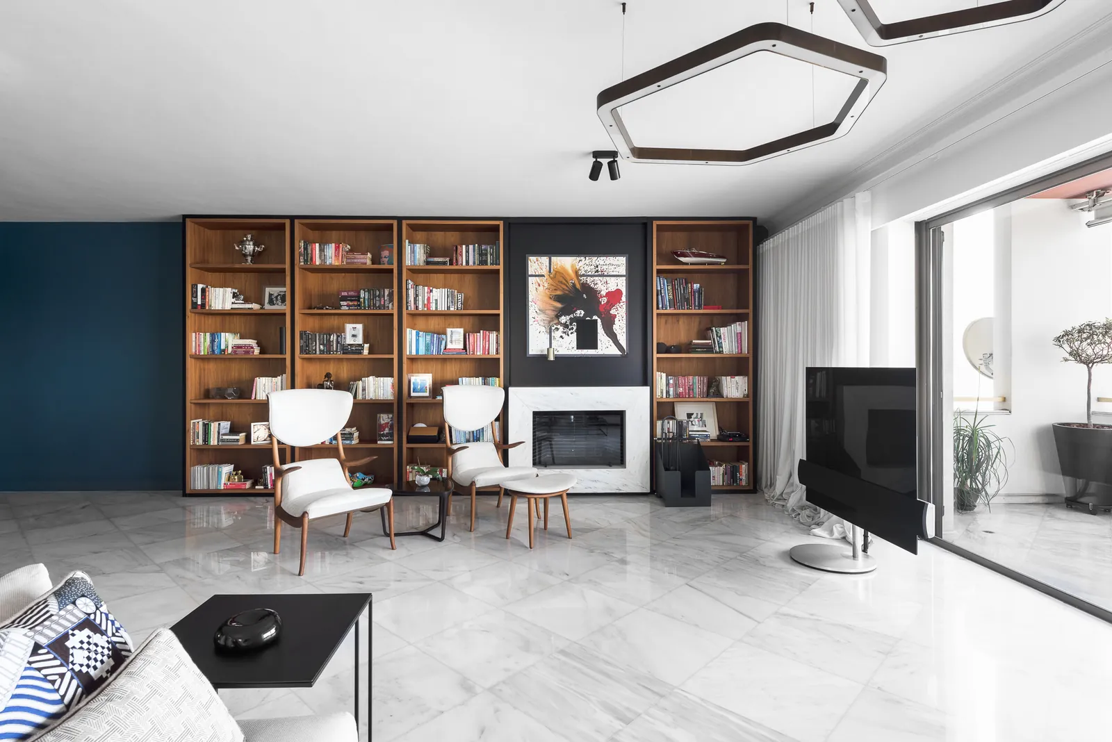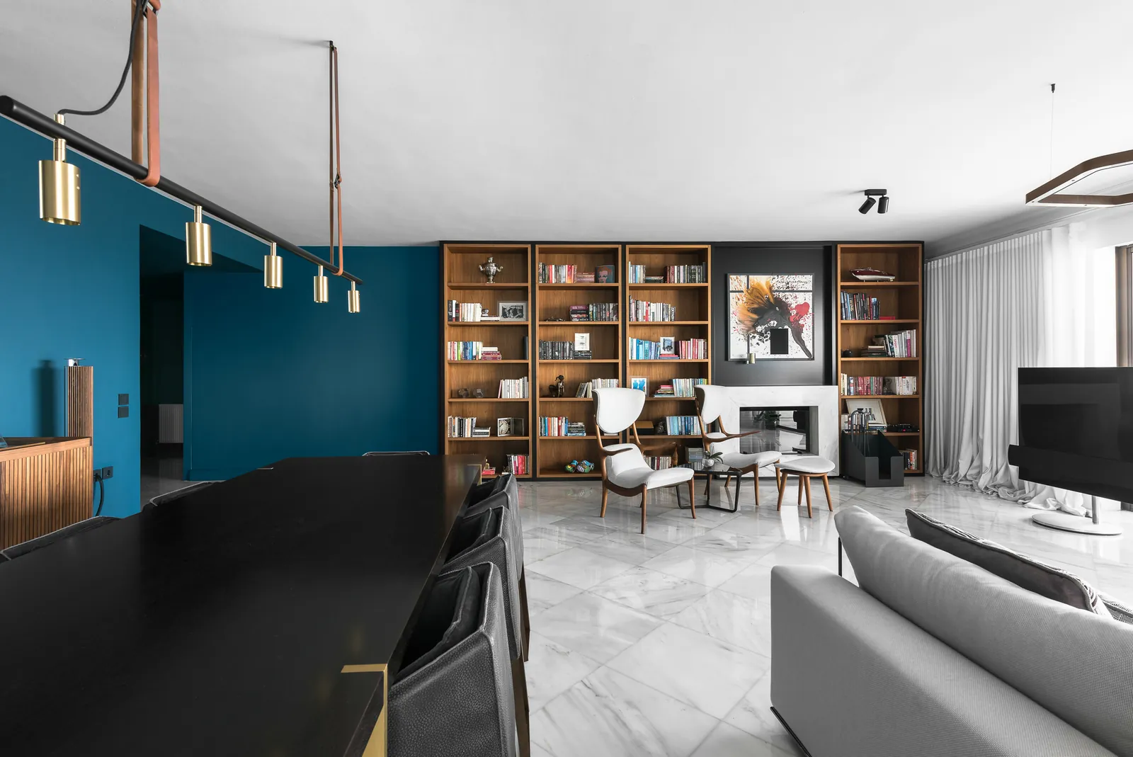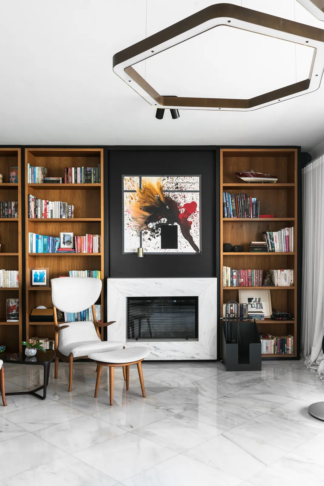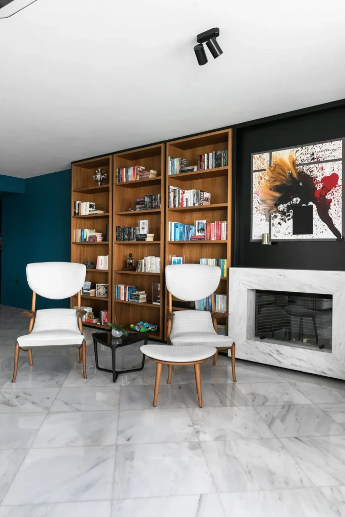 Ένα κομψό σαλόνι ανάγνωσης όπου τα ζεστά ξύλινα ράφια, τα γλυπτικά καθίσματα και η επιμελημένη τέχνη δημιουργούν έναν ισορροπημένο διάλογο μεταξύ άνεσης και αρχιτεκτονικής σαφήνειας.