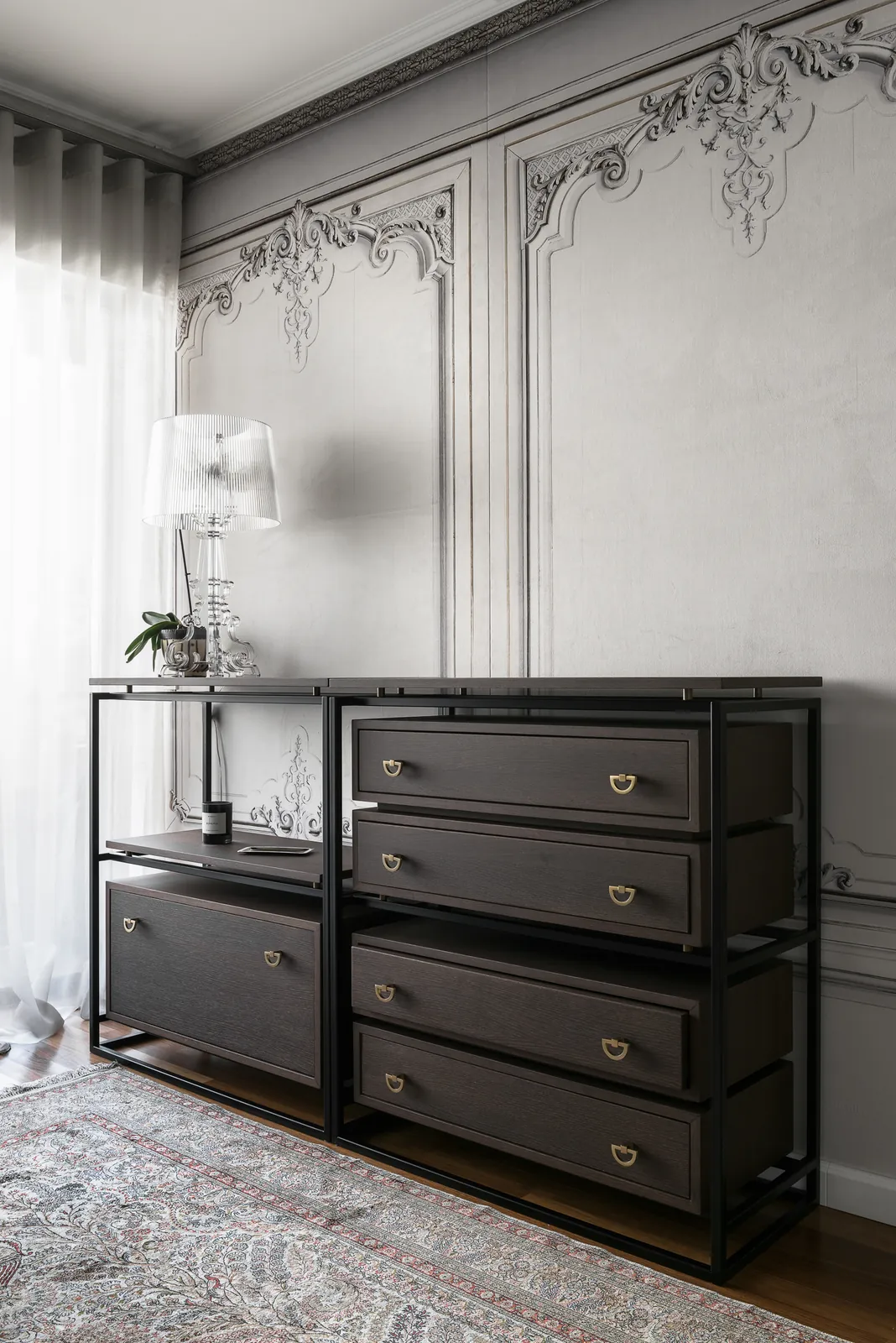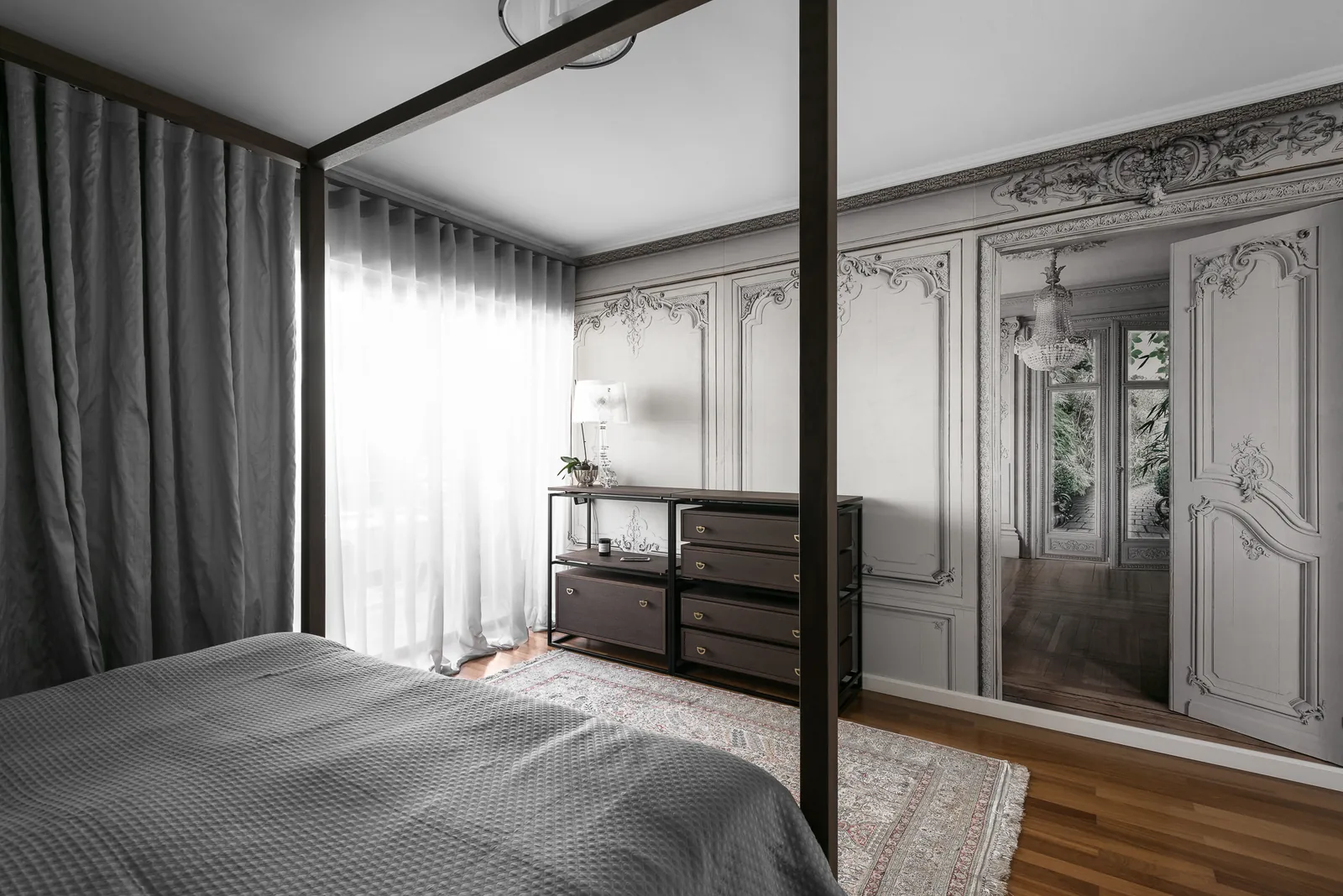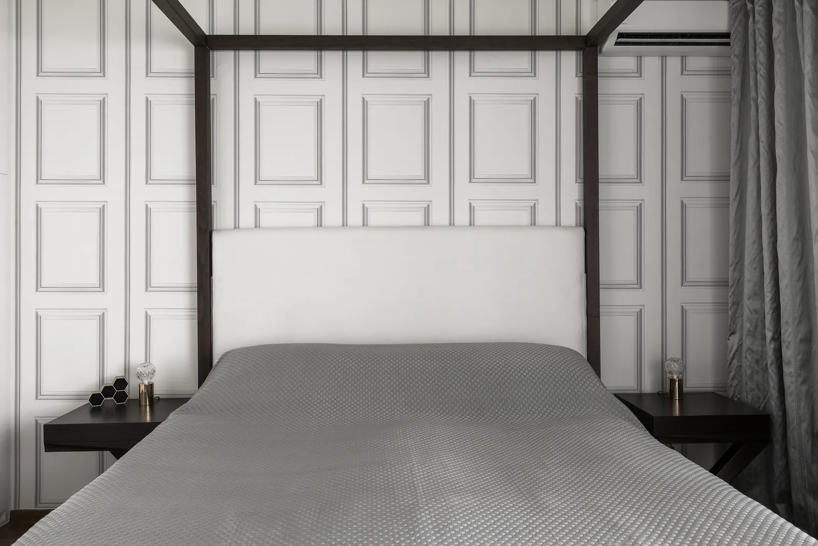 Μια σύγχρονη επανερμηνεία του κρεβατιού με ουρανό, όπου οι καθαρές γραμμές, τα απαλά υφάσματα και οι κλασικές λεπτομέρειες στους τοίχους δημιουργούν ένα ήρεμο, δομημένο περιβάλλον ύπνου.