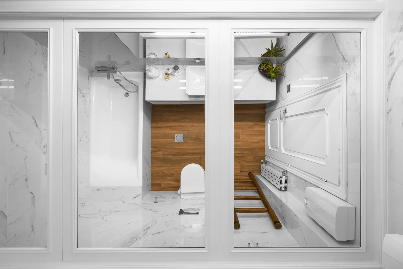 Οι βοηθητικοί χώροι—συμπεριλαμβανομένης της κουζίνας, των μπάνιων και της ντουλάπας—αντιμετωπίζονται ως αναπόσπαστα στοιχεία της αρχιτεκτονικής αφήγησης και όχι ως δευτερεύουσες ζώνες. Εδώ χρησιμοποιούνται σύγχρονα, απλοποιημένα στοιχεία, με ακριβείς λεπτομέρειες και εκλεπτυσμένες επιλογές υλικών που γεφυρώνουν τις παραδοσιακές αναφορές του διαμερίσματος με μια πιο μοντέρνα αισθητική.