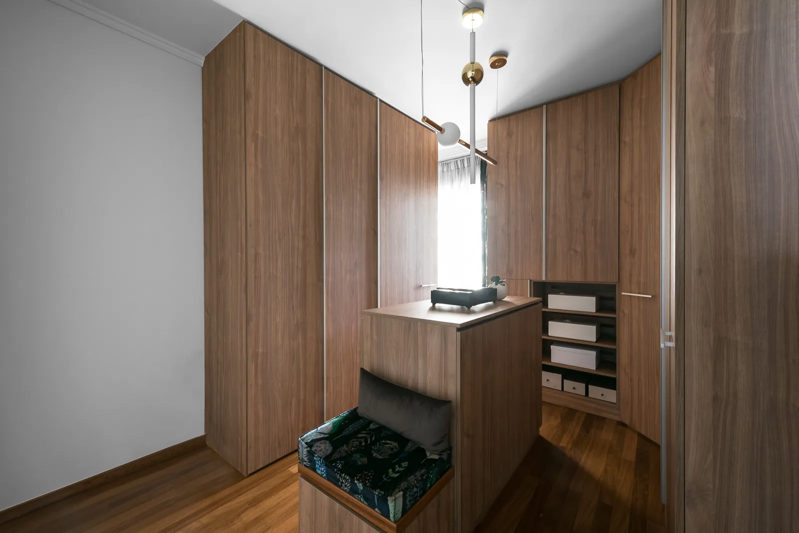 Στους ιδιωτικούς χώρους, η ατμόσφαιρα μεταβάλλεται προς τη ζεστασιά και την οικειότητα. Τα υπνοδωμάτια χαρακτηρίζονται από φυσικό δρύινο δάπεδο σε συνδυασμό με πιο ρουστίκ λεπτομέρειες γύψου, εισάγοντας μια απτική, γειωμένη ποιότητα που έρχεται σε διακριτική αντίθεση με τις γυαλισμένες επιφάνειες των χώρων διαβίωσης. Αυτή η μετάβαση υλικών ενισχύει τη χωρική ιεραρχία του διαμερίσματος, διακρίνοντας τις κοινωνικές και ιδιωτικές λειτουργίες διατηρώντας παράλληλα τη συνολική συνοχή.