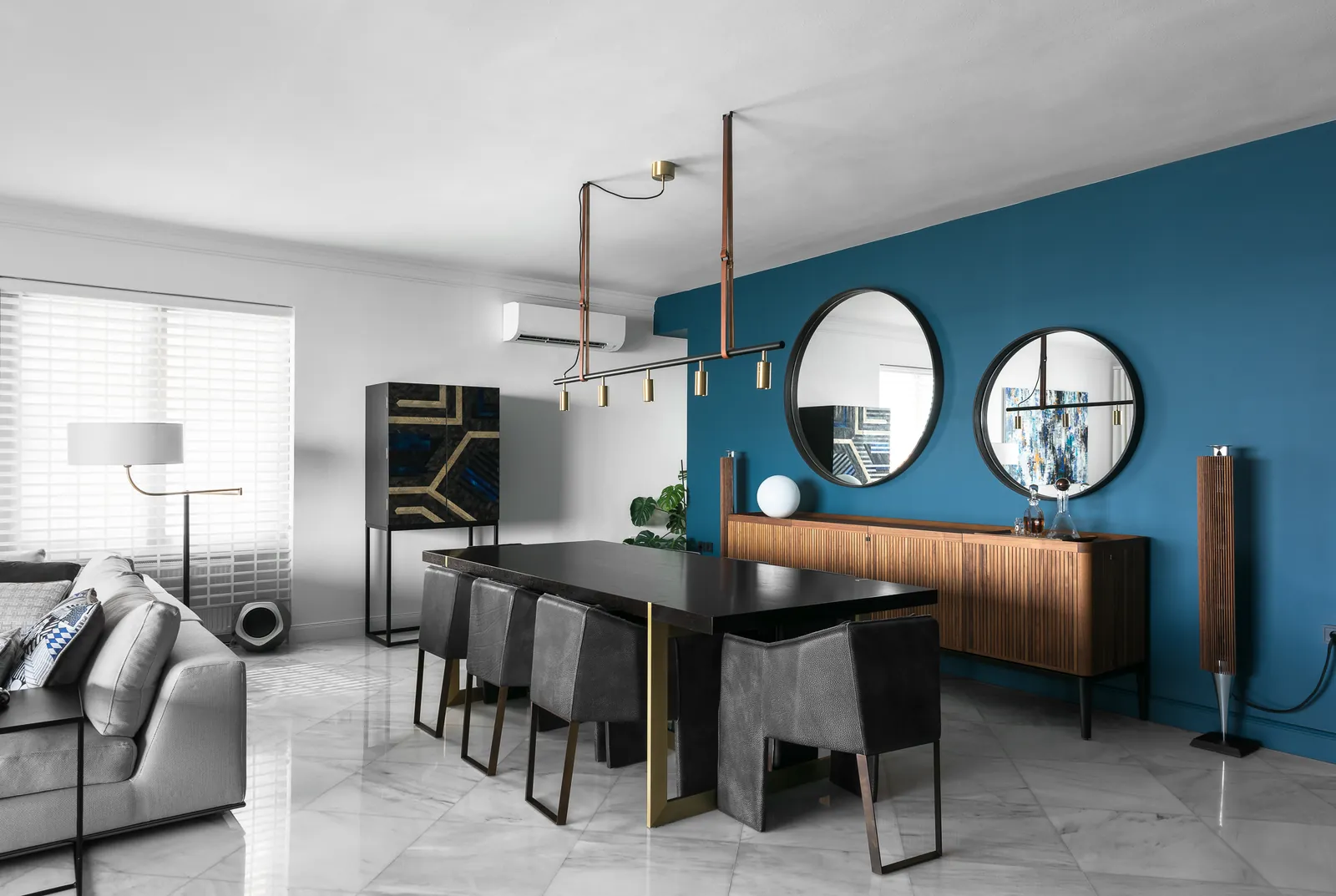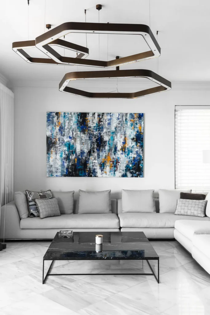 Μια γλυπτική σύνθεση φωτισμού αγκυρώνει το δωμάτιο, όπου η διαστρωματωμένη γεωμετρία, οι απαλοί ουδέτεροι τόνοι και η σύγχρονη τέχνη δημιουργούν ένα ήρεμο αλλά εκφραστικό περιβάλλον διαβίωσης.
