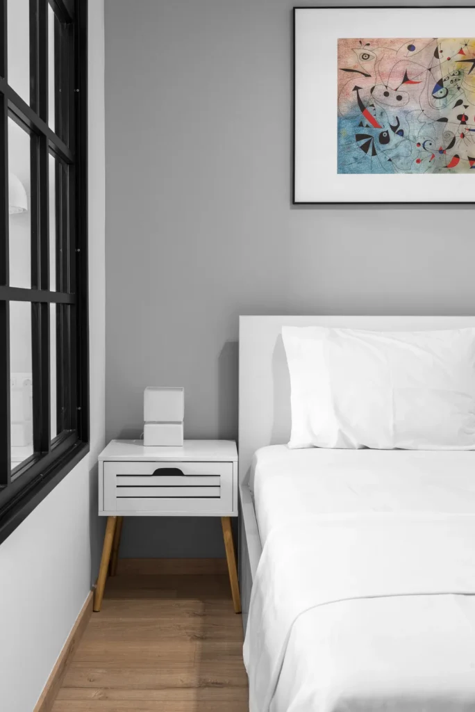 Ένα ήρεμο, μονοχρωματικό υπνοδωμάτιο που καθορίζεται από καθαρές γραμμές και κορνιζαρισμένα τζάμια, όπου η διαφάνεια συνδέει ιδιωτικούς και καθιστικούς χώρους διατηρώντας παράλληλα την οπτική τάξη και ισορροπία.