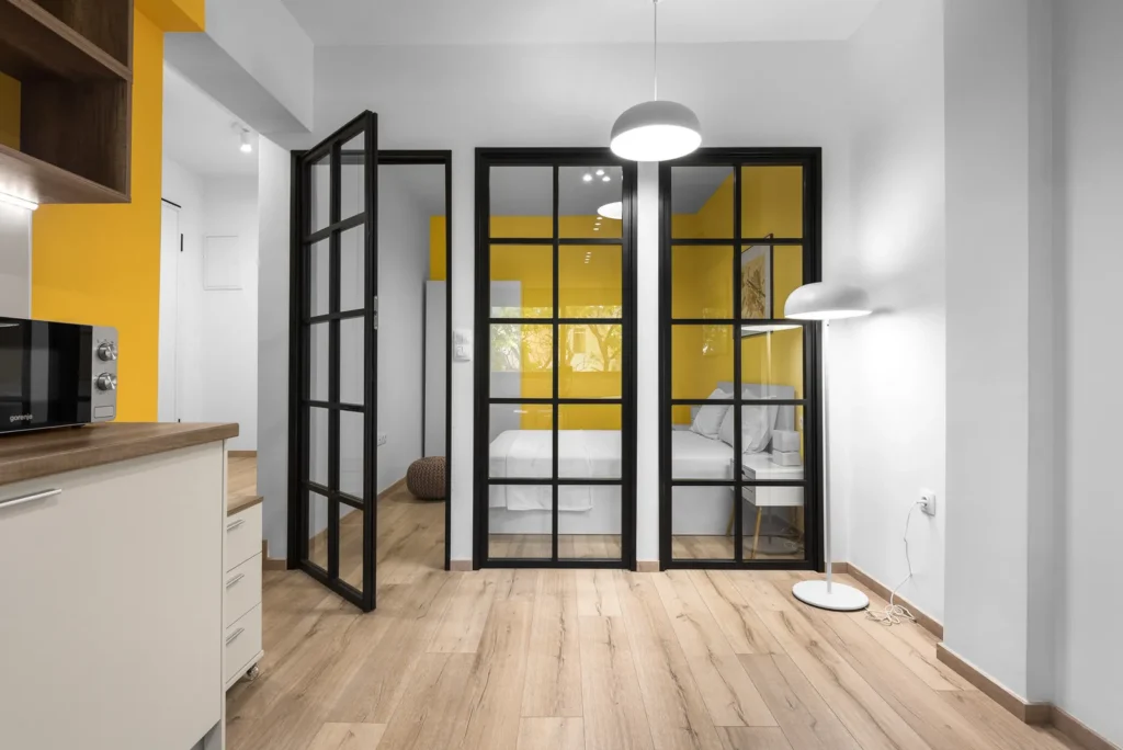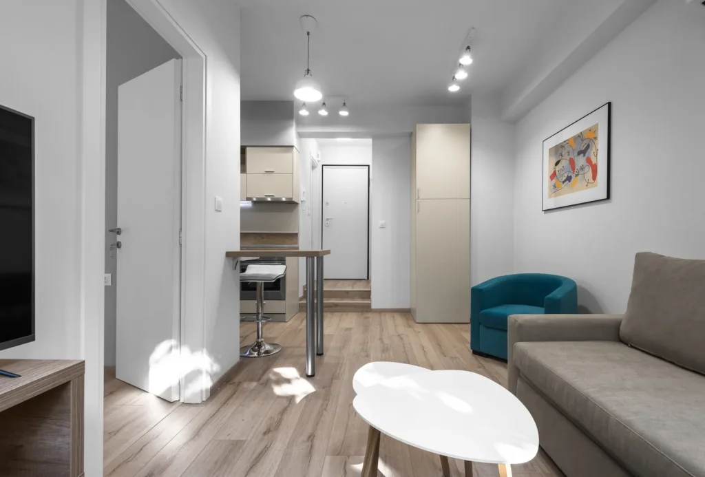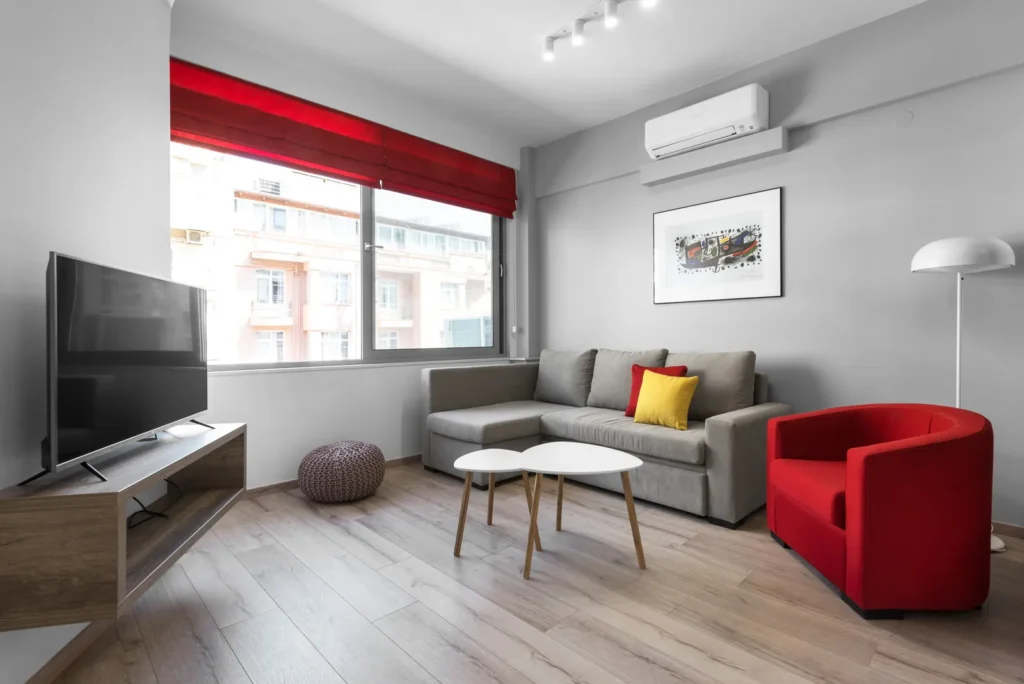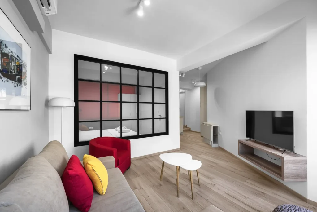 Ο εσωτερικός σχεδιασμός βασίζεται σε μια απαλή, ουδέτερη παλέτα λευκών, μπεζ και γκρι τόνων, εφαρμοσμένη σε έπιπλα και υφάσματα για να δημιουργήσει ένα γαλήνιο και συνεκτικό φόντο. Ενάντια σε αυτόν τον συγκρατημένο καμβά, προσεκτικά επιλεγμένες φωτεινές χρωματικές πινελιές αναδεικνύουν συγκεκριμένα στοιχεία σχεδιασμού, προσθέτοντας ζωντάνια και χαρακτήρα χωρίς να διαταράσσουν τη συνολική ισορροπία του χώρου. Το ξύλινο δάπεδο ενοποιεί τους εσωτερικούς χώρους, εισάγοντας ζεστασιά και ενισχύοντας μια αίσθηση οικιακής οικειότητας μέσα στο αστικό περιβάλλον.