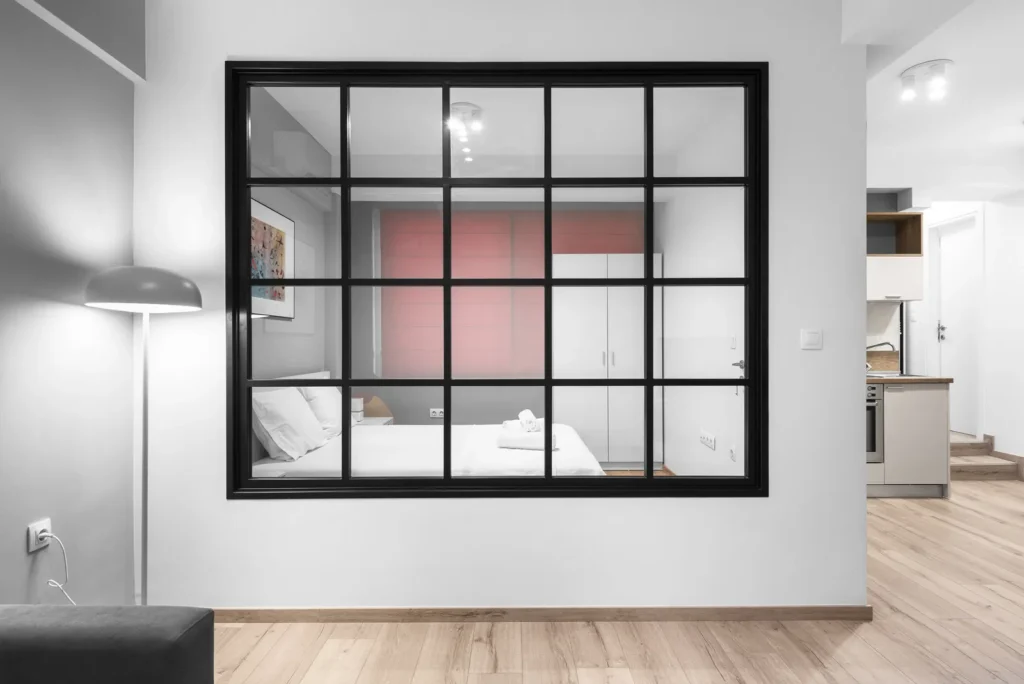 Ένα οπτικά συνδεδεμένο υπνοδωμάτιο που καθορίζεται από κορνιζαρισμένα γυάλινα διαχωριστικά που δημιουργούν στρωματοποιημένες θεάσεις και μια συνεχή χωρική ακολουθία σε όλο το διαμέρισμα.