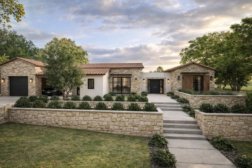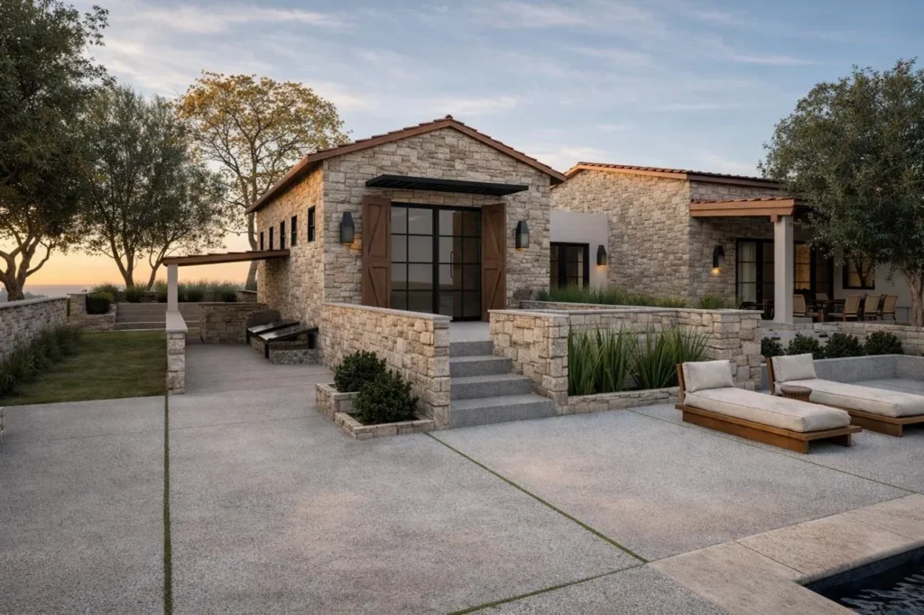 Η αρχιτεκτονική γλώσσα αντλεί από την παραδοσιακή μεσογειακή υλικότητα, εκφρασμένη μέσω φυσικών πέτρινων προσόψεων, κεραμιδιών οροφής και τοίχων με υφή. Αυτά τα στοιχεία ενισχύουν τη θερμική απόδοση και το οπτικό βάθος. Μεγάλα υαλωτά ανοίγματα, εσοχές βεραντών και πλαισιωμένοι εξωτερικοί χώροι διαλύουν το όριο μεταξύ εσωτερικού και εξωτερικού, επιτρέποντας στο φυσικό φως, το τοπίο και την εποχιακή αλλαγή να γίνουν αναπόσπαστα στοιχεία της χωρικής εμπειρίας.