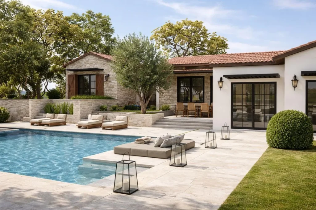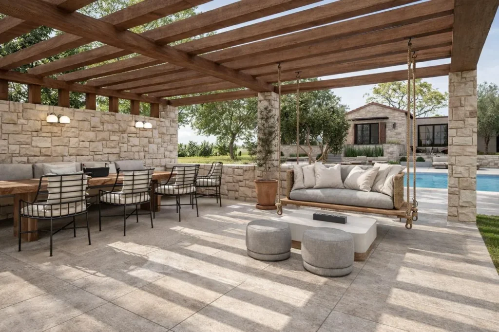 Μια ακολουθία σκιασμένων περγκολών οργανώνει τους εξωτερικούς χώρους διαβίωσης, δημιουργώντας πολλαπλές ζώνες για φαγητό, χαλάρωση και κοινωνική συγκέντρωση, συμβάλλοντας παράλληλα στον παθητικό έλεγχο του κλίματος. Η σύνθεση του τοπίου αγκυρώνεται από μια γενναιόδωρη πισίνα με ενσωματωμένο νησί-σαλόνι, διαμορφώνοντας ένα σημείο εστίασης για αναψυχή και υπαίθρια ζωή και ενισχύοντας τον χαρακτήρα της βίλας που θυμίζει θέρετρο.