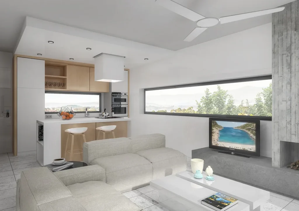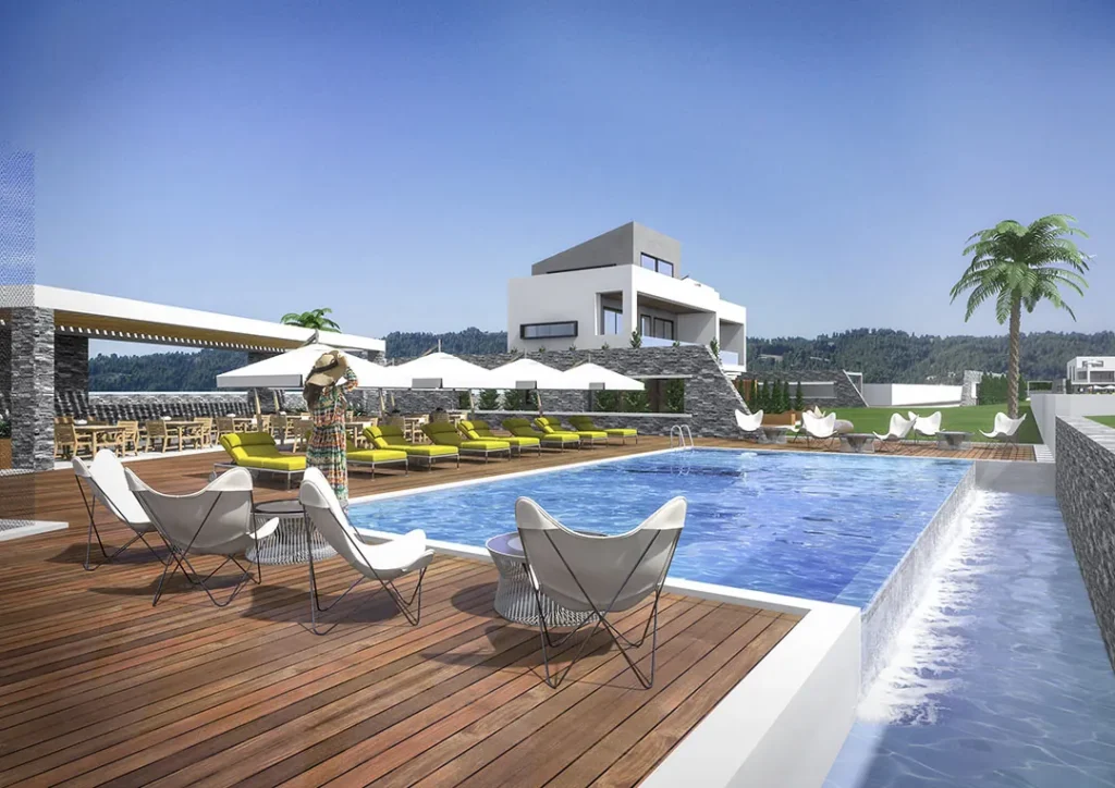 The complex enjoys uninterrupted views of the Aegean Sea, the dramatic sunsets of Chalkidiki, and the distant silhouette of Mount Olympus. These natural elements are not treated as a backdrop, but as integral components of the architectural concept. The positioning, orientation, and massing of the residences are carefully calibrated to frame views, maximize daylight, and ensure privacy while maintaining a strong connection to the surrounding landscape.