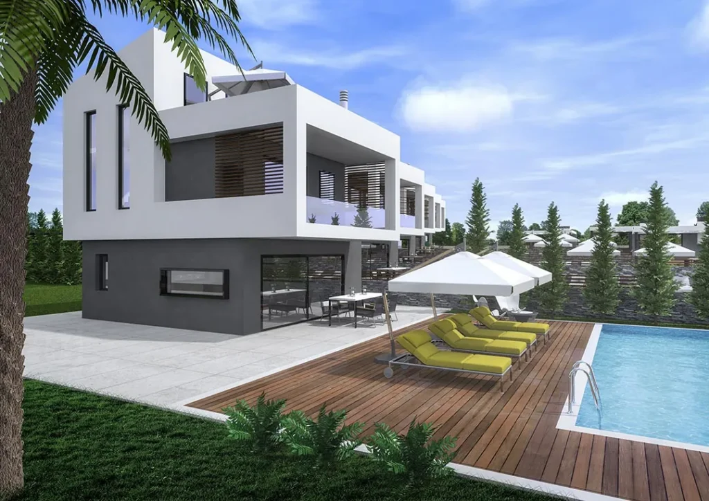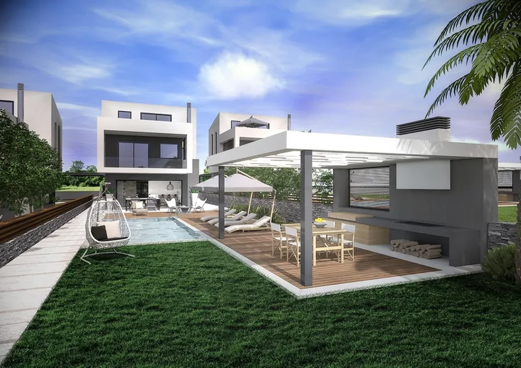 The development unfolds in two distinct complexes. Delight 1 consists of five fully equipped residences complemented by shared amenities including a swimming pool, tennis court, BBQ area, landscaped gardens, and private parking. Delight 2 comprises five independent houses, each featuring its own private swimming pool, tennis court, BBQ facilities, and exclusive garden, offering a heightened sense of autonomy and seclusion.