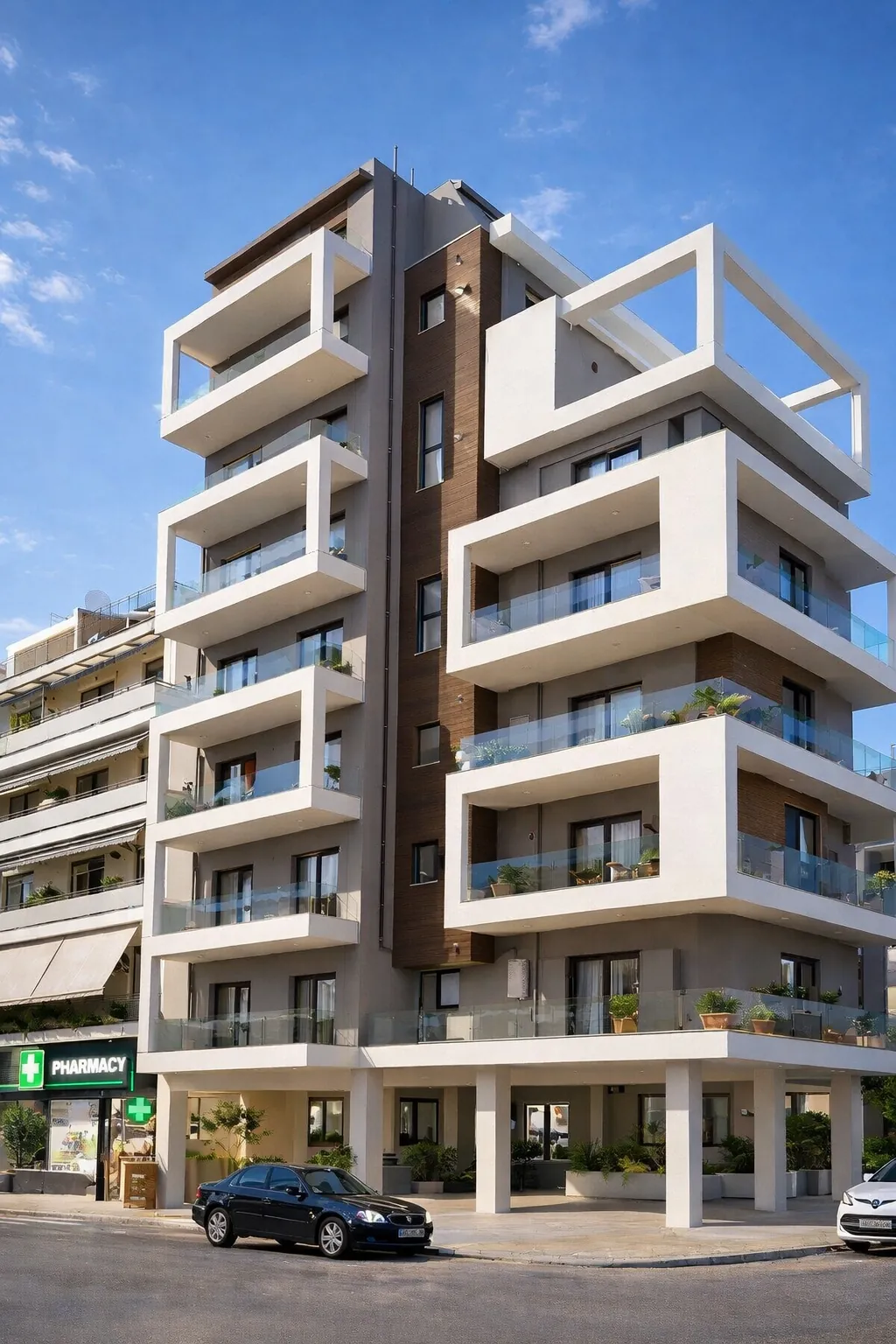 This contemporary residential building articulates a strong urban presence through a balanced composition of horizontal slabs and deep recessed balconies, creating a clear architectural rhythm while enhancing privacy, shading, and spatial depth. The volumetric arrangement emphasizes transparency and lightness, allowing the building to integrate naturally into its dense urban context while maintaining a distinct architectural identity.